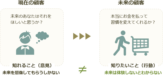 未来の顧客が本当に行動するかは、意見ではなく体験と行動で確かめる必要があります。