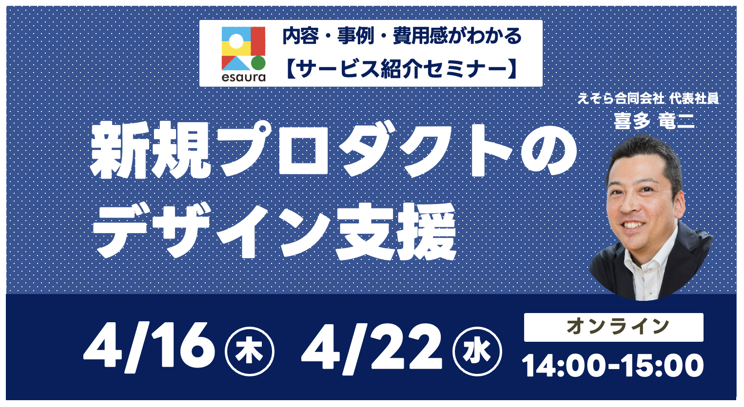 本セミナーでは、えそらLLC の新規事業におけるデザイン支援について、「どんな事業や課題と相性が良いのか」「具体的に何をやってくれるのか」「いくらかかるのか」等、事例をふまえてご紹介します。