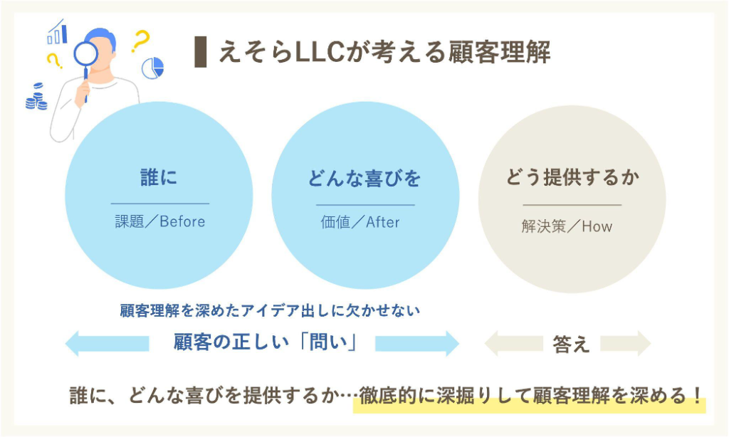 曖昧な予測だけの浅い顧客理解で終わってしまうのではなく、しっかりと時間をかけて顧客の本当のニーズや悩みを発見して、それを解決するために提供できる解決策(サービス・商品)について考えることが大切です。