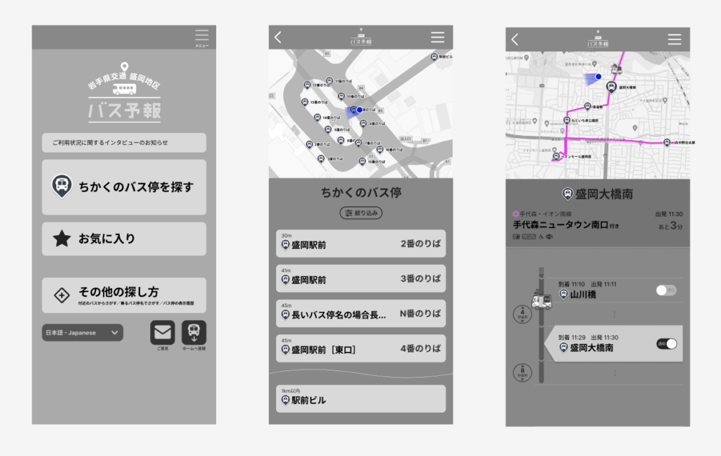 大久保様:最初のページの「近くのバス停を探す」でしょうか。現在の画面では路線情報が文字だけで表示されているのですが、提案いただいた案では地図と路線の情報が一緒に表示されていて、視覚的に分かりやすくなっているところがすごく良いと思いました。
