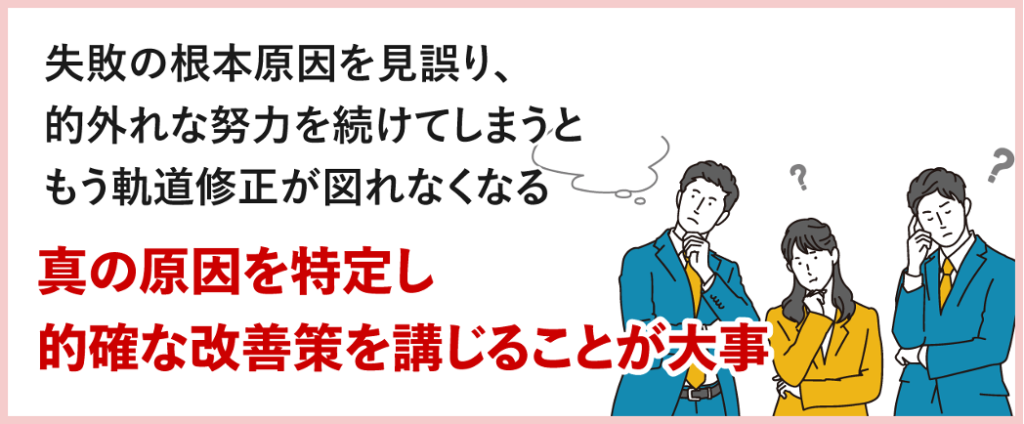 このとき、非常にまずいのは、失敗の根本原因を見誤り、的外れな努力を続けてしまうことです。苦しみが増すばかりで、会社が負うダメージも大きくなります。