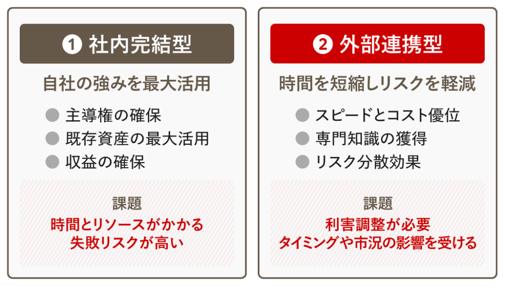 逆に、他社との協業や出資を通じて進める場合は、すでに立ち上がっている仕組みに乗ることでスピードやコストの面で有利になります。リスクを分散できるのも利点です。