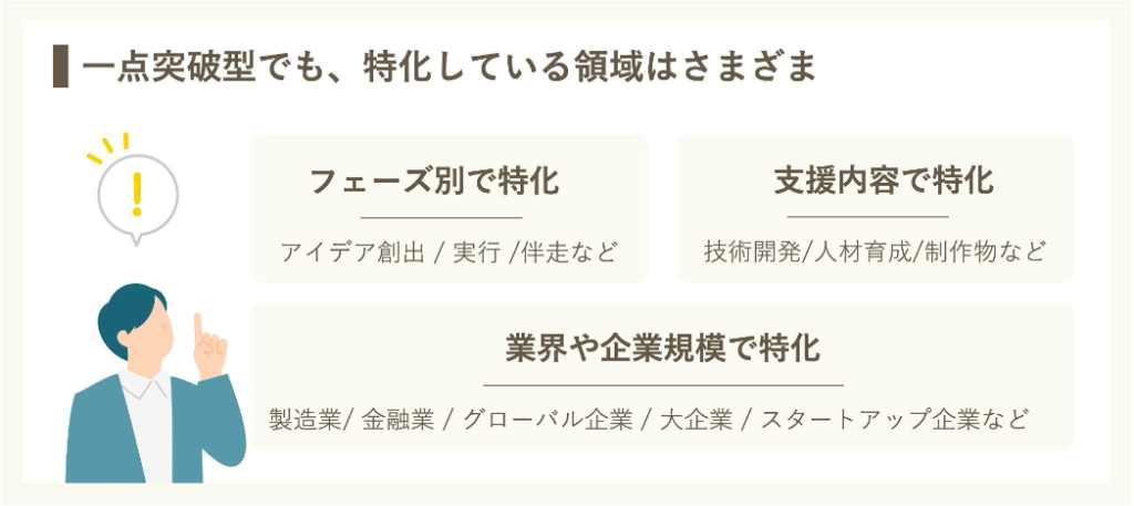 新規事業開発支援のなかでも、特定の支援タイミングや支援内容、業界などに強みがあるのが「一点突破型の新規事業サポート会社」の特徴です。