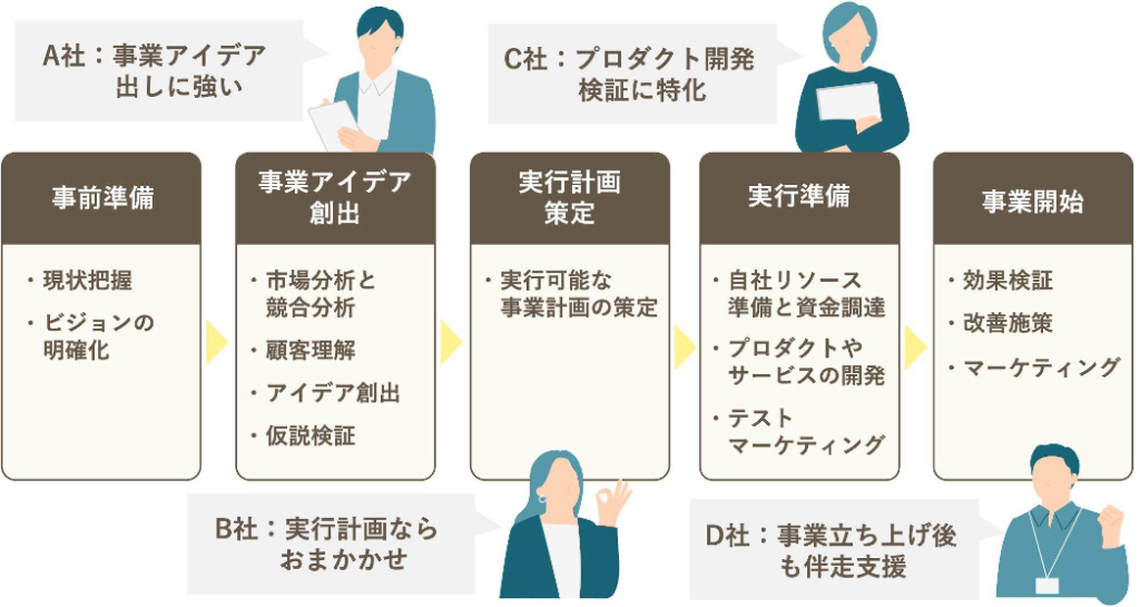 たとえば、新規事業の土台となる事業アイデア創出に長けているサポート会社もあれば、あなたが持っているアイデアの開発支援に強いサポート会社もあります。