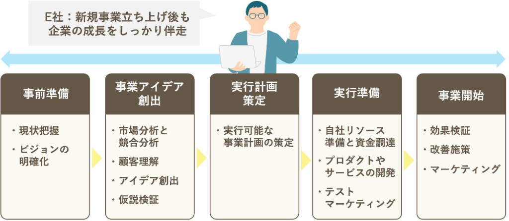 新規事業の開発支援を、ゼロから事業立ち上げ、そして立ち上げ後の成長・拡大までサポートするのが「総合支援型のサポート会社」です。