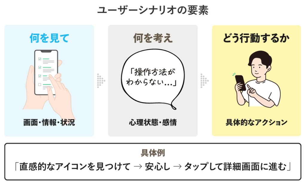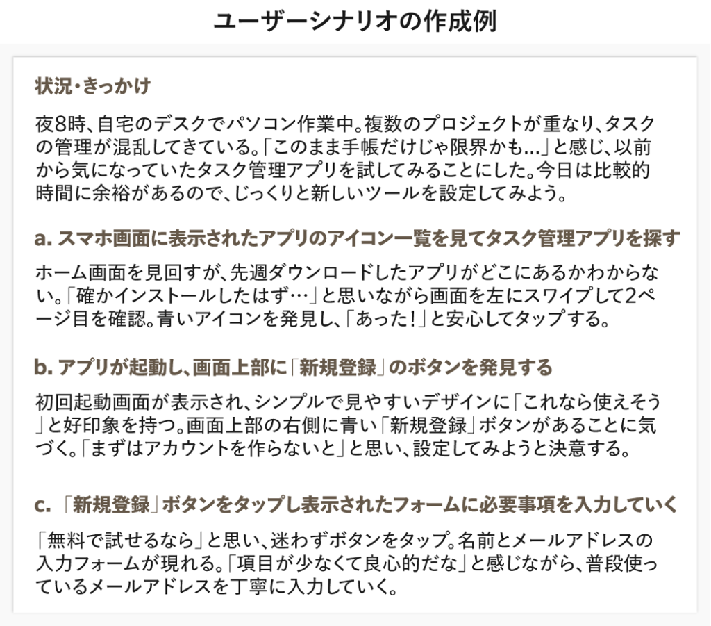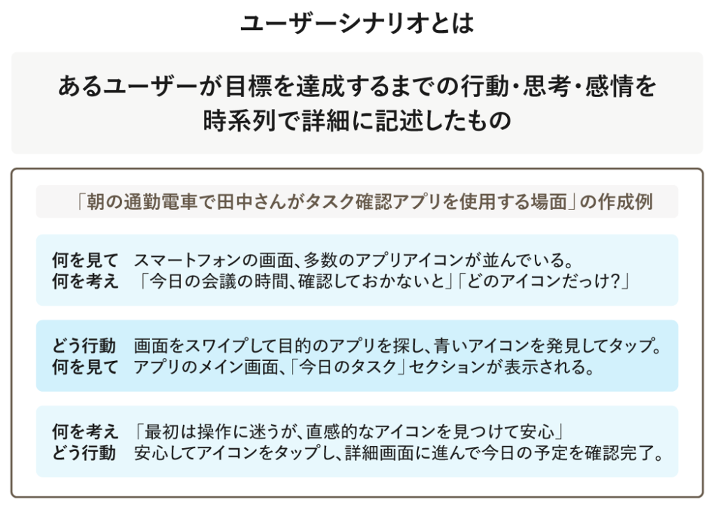 「朝の通勤電車で田中さんがスマートフォンを取り出し、アプリを開いて今日のタスクを確認する。最初は操作に迷うが、直感的にわかるアイコンを見つけて安心し、タップして詳細画面に進む」といったレベルまで具体化します。