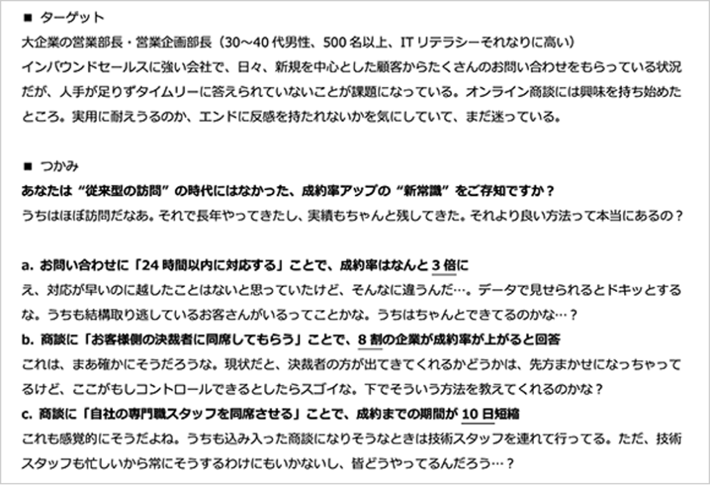 以下は、オンライン商談システムのサービスサイトのために書かれたシナリオです。