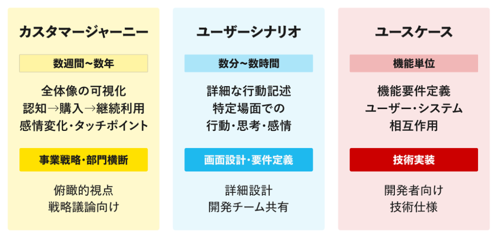 カスタマージャーニーは顧客の体験全体を俯瞰的に捉える手法、ユースケースはシステムとユーザーの相互作用を要件定義レベルで記述する手法、ユーザーシナリオは特定の場面での詳細な行動と心理を記述する手法という違いがあります。