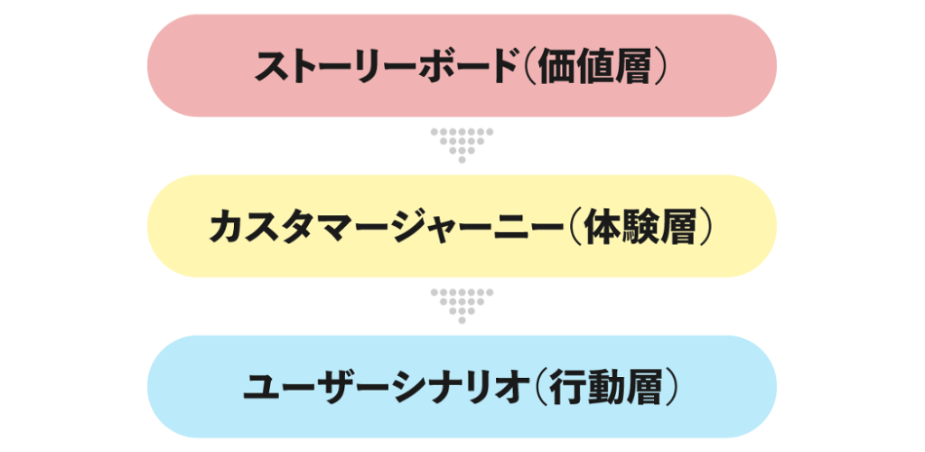 重要なのは、ユーザーシナリオはいきなり作るのではなく、「ストーリーボード」→「カスタマージャーニー」 → 「ユーザーシナリオ」と段階を経てブレイクダウンするという点です。