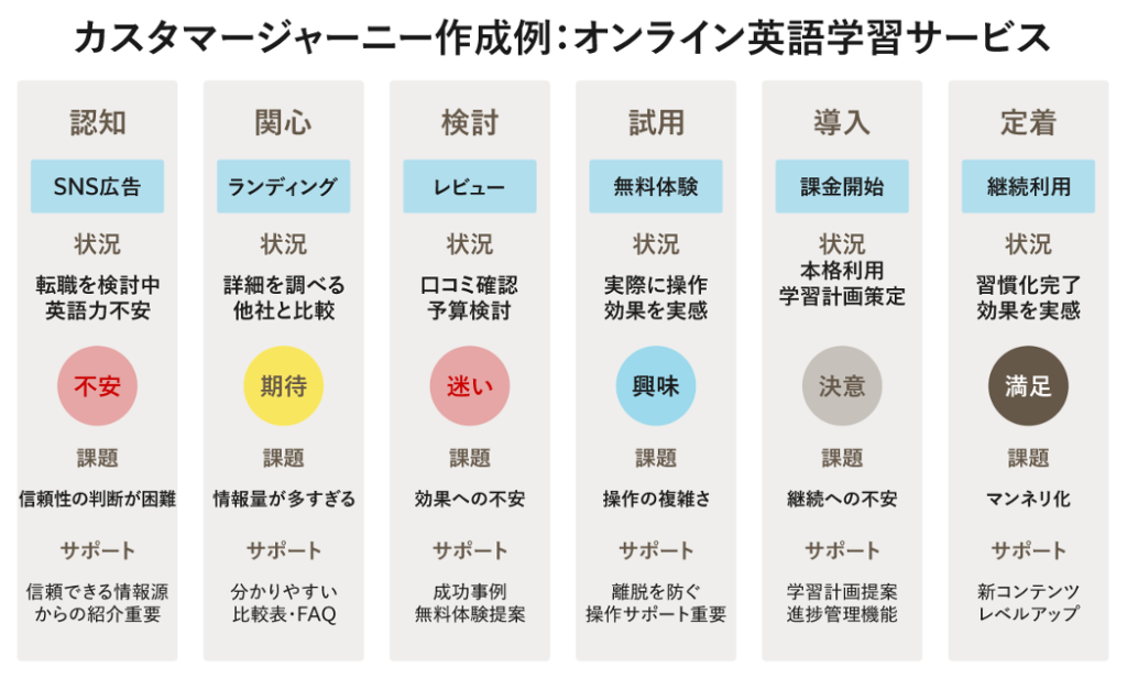 認知→関心→検討→試用→導入→定着といった段階ごとに、顧客の状況や感情がどう変化するかを詳細に整理します。数日〜数カ月(場合によってはそれ以上)にわたる体験フローを可視化し、各フェーズでの課題や感情変化、必要なサポートも含めて設計するのが特徴です。