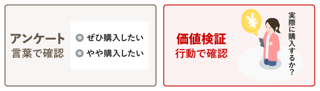 言葉による意見だけでなく、「実際にお金を払うか?」「継続して使うか?」といった顧客の “行動” によって裏付けを取ることが、価値検証の目的です。