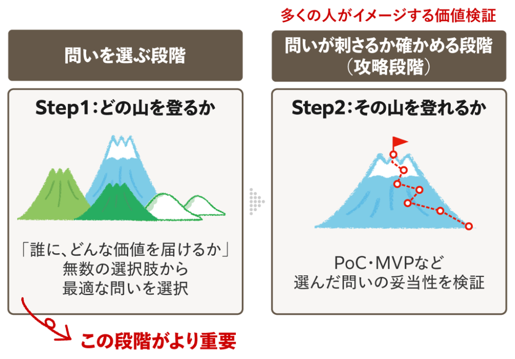 価値検証には、2つの段階があります。「問いを選ぶ段階」と、「選んだ問いが刺さるか確かめる段階(攻略段階)」です。多くの人が価値検証といって思い浮かべるMVP検証は、攻略段階です。